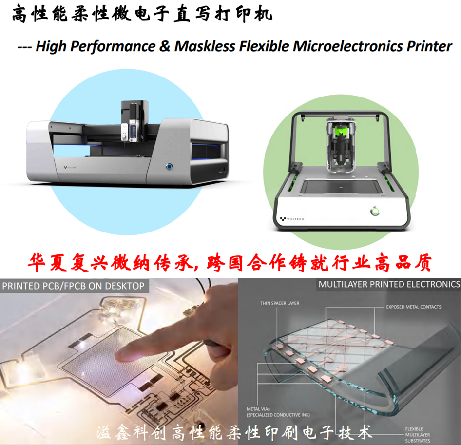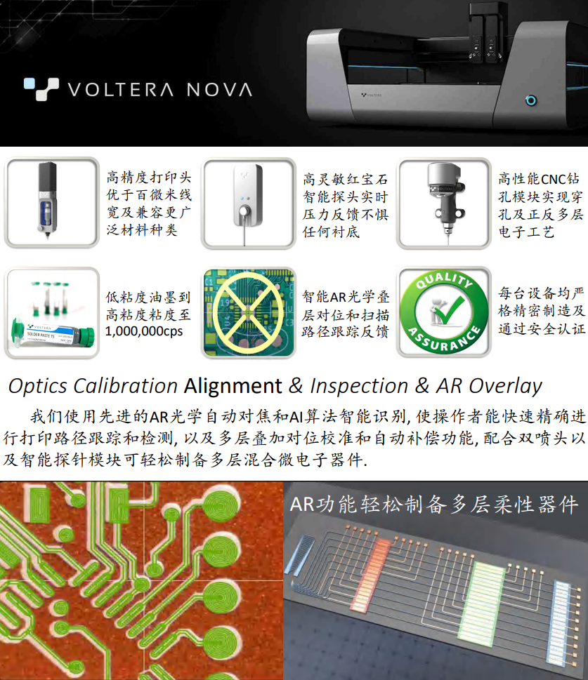 基于先进的高精度挤出式增材制造技术, 搭配有高精度打印头, 高灵敏智能探头, 闭环压力反馈, 光学叠层对位, 扫描路径跟踪反馈等先进功能, 兼容从低粘度油墨到高粘度浆料的无掩模打印, 即使不平衬底上也能应对自如, 不但解决了传统工艺诸多技术瓶颈且不挑材料和不惧复杂衬底; 现我们设备全球已销售数千台且任命溢鑫科创为Voltera NOVA中国区独家指定授权, 遍布各微尺度增材制造和柔性印刷电子实验室且好评如潮;