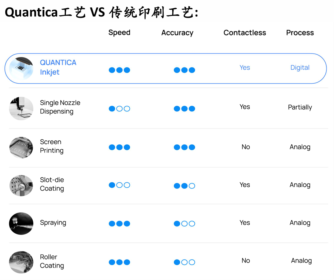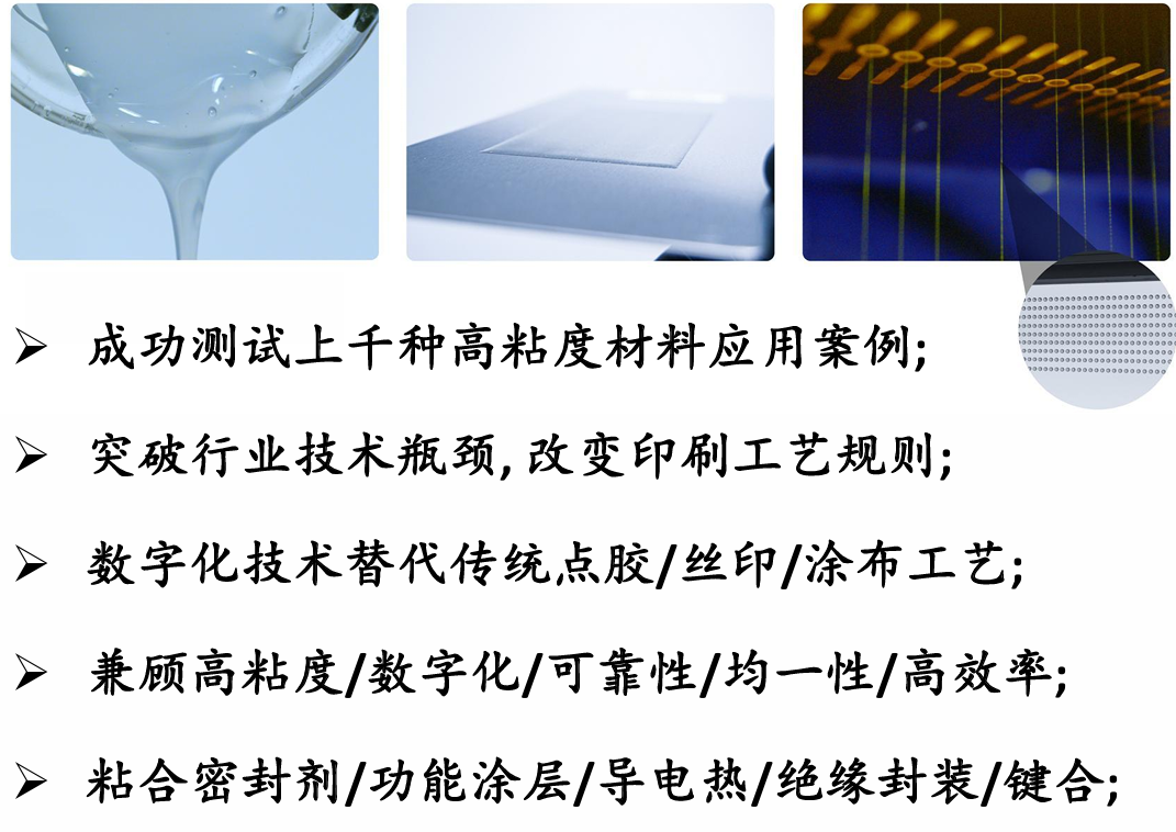 Quantica先进数字化喷墨技术的高粘度材料喷射能力, 比传统压电或热泡式喷墨高出15-20倍以上,