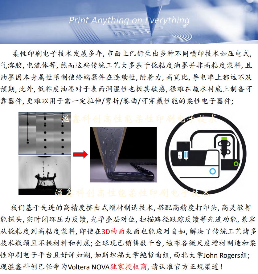 基于先进的高精度挤出式增材制造技术, 搭配有高精度打印头, 高灵敏智能探头, 闭环压力反馈, 光学叠层对位, 扫描路径跟踪反馈等先进功能, 兼容从低粘度油墨到高粘度浆料的无掩模打印, 即使不平衬底上也能应对自如, 不但解决了传统工艺诸多技术瓶颈且不挑材料和不惧复杂衬底; 现我们设备全球已销售数千台且任命溢鑫科创为Voltera NOVA中国区独家指定授权, 遍布各微尺度增材制造和柔性印刷电子实验室且好评如潮;
